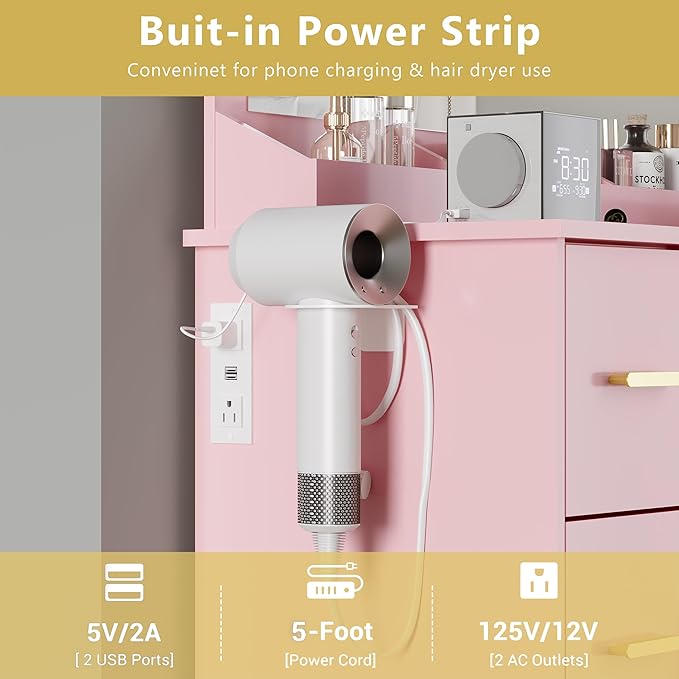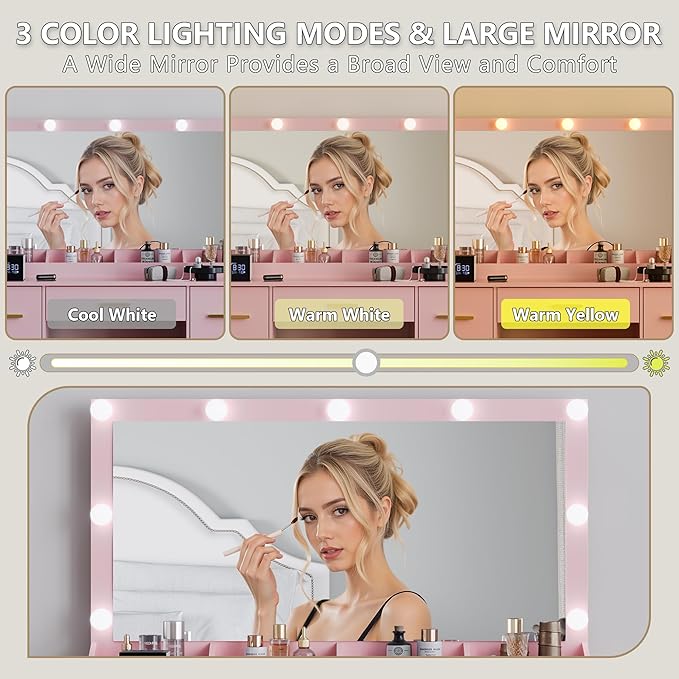 Makeup Vanity with Large Lighted Mirror and Chair, 7 Drawers Vanity Makeup Desk Table with Power Strip, Adjustable Lighting, and Cushioned Storage Stool for Women, Girls