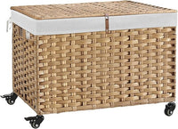 Rolling Storage Basket with Lid, 47.6 Gallon (180L) Storage Bin with Wheels, Woven Rattan Blanket Storage Basket with Handles, Foldable, Metal Frame, Removable Liner for Bedroom, Laundry Room, Natural