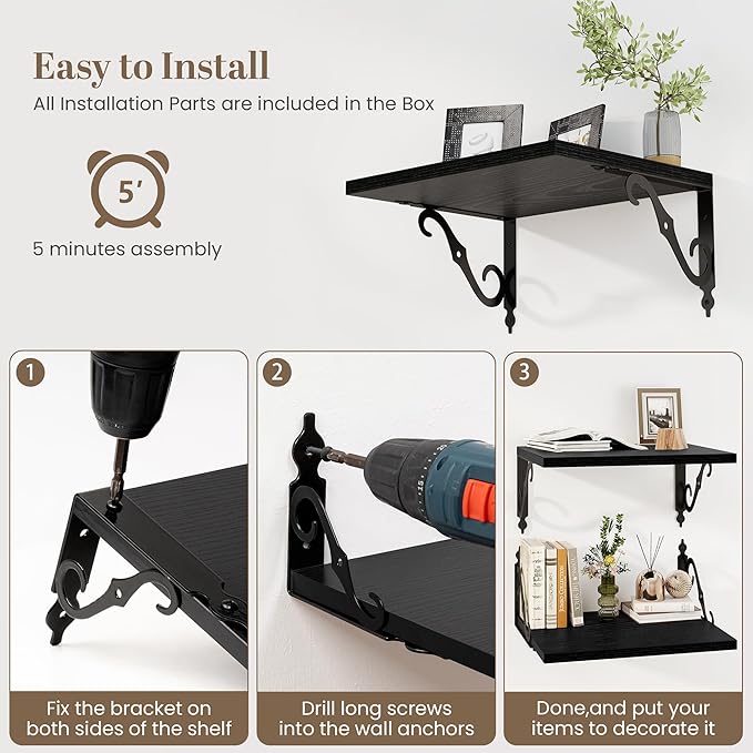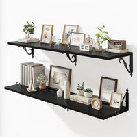Fun Memories Large Floating Shelves for Wall 48 Inches Long, 12 Inch Deep Shelves with Metal Bracket, 48 Inch Floating Shelves Wall-Mounted, Wide Display & Storage Bookshelves, Black, Set of 2
