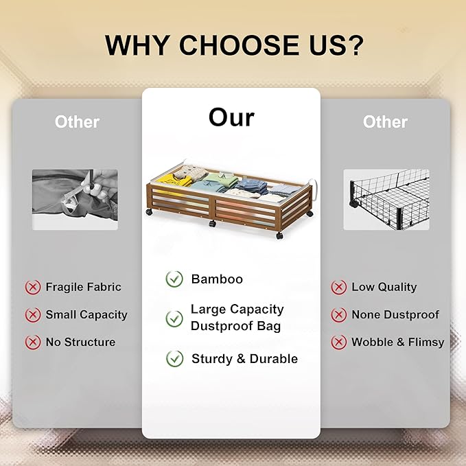 Under Bed Storage Containers With Wheels - 2 Pcs Large Bamboo Wood Rolling Underbed Shoe Storage Bins With Dust Bags for Clothes Blankets, Duvet Covers Snacks Toys (Walnut)