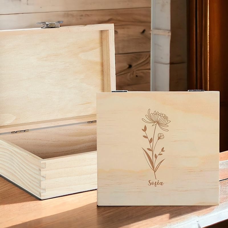 Personalized Birth Flower Memory Box Custom Engraved Wooden Keepsake Chest with Floral Design - Storage Boxes for Jewelry Photos Memento Keepsakes Customized Gifts for Women Birthday Mother's Day