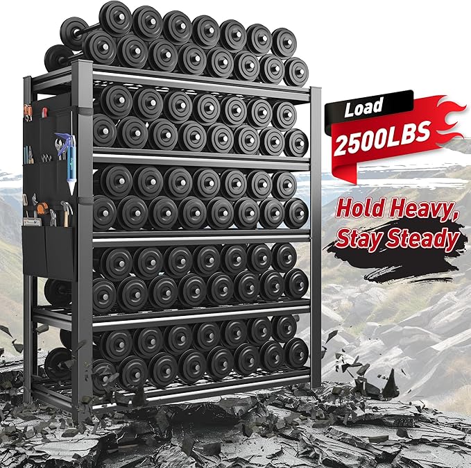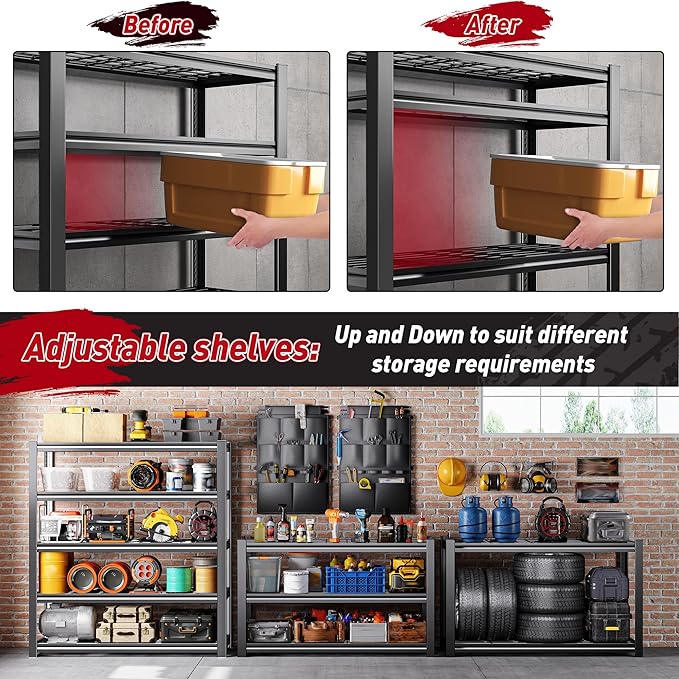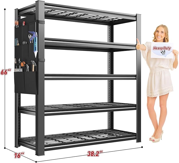 REIBII Storage Shelves, Heavy Duty Garage Shelving Load 2500LBS, 5-Tier Garage Shelves with Tool Storage Bag, Adjustable Industrial Metal Shelving for Basement, 66" H x38.2 W x16 D, Black
