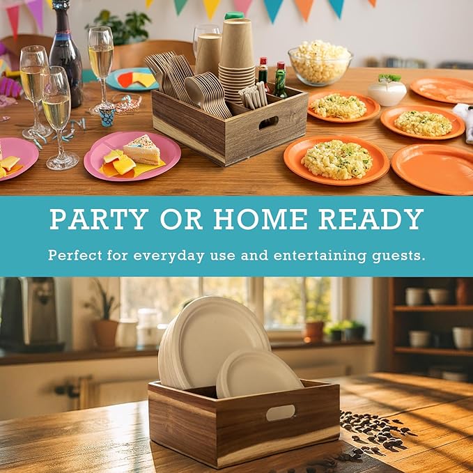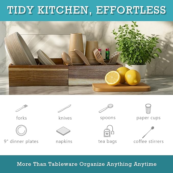 2 Set of Acacia Utensil Holder for Party - Wood Utensil Caddy for Parties and Paper Plate Dispenser for Countertop - Organize Cups, Spoons, Forks, Plates, Napkins - Kitchen Accessories