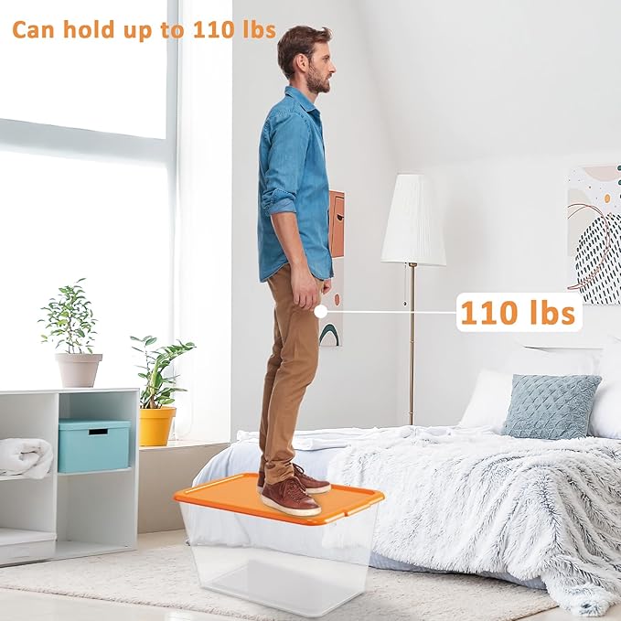 Storage Totes with Lids - Made in USA 14.5-Gallon (58-Quart) 4-Pack storage bins with lids plastic storage containers large storage boxes for Organizer Orange/Clear