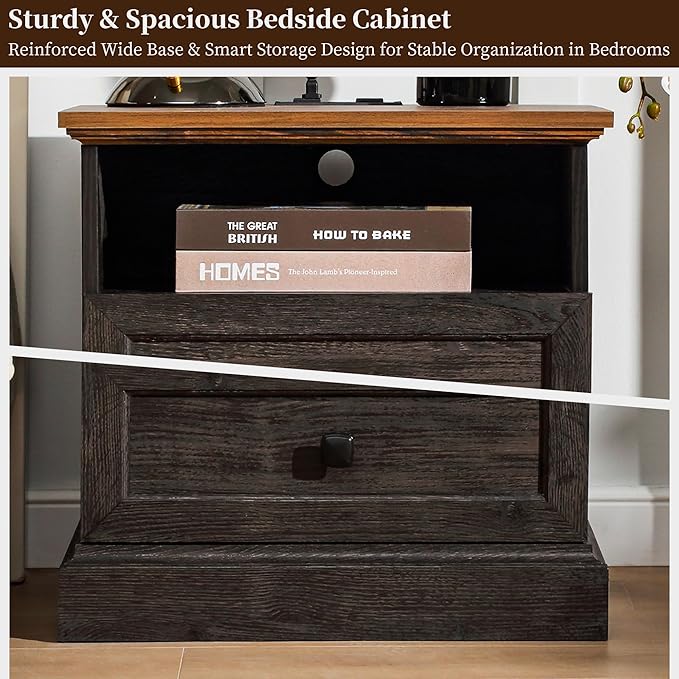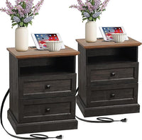 Night Stand Set of 2 with Charging Station, Bedside Table with 2 Drawers Storage and Open Shelf, Wood Farmhouse Nightstands with Outlets for Bedroom Office, Espresso