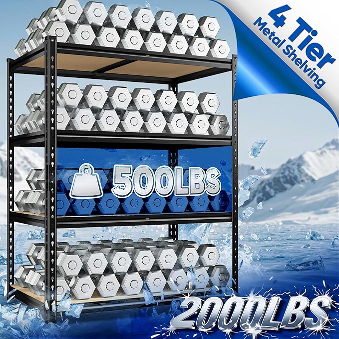 40" W Garage Shelving, 4 Tier Storage Shelves Load 2000 lbs, Adjustable Garage Shelves, Metal Shelving Unit for Warehouse, Basement, Pantry, 40" Wx 16" D x 60" H, Black