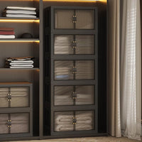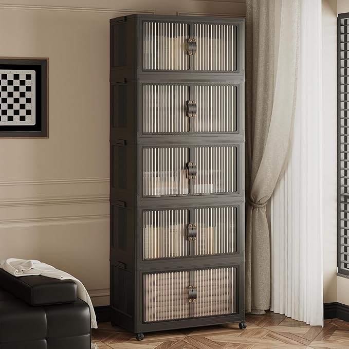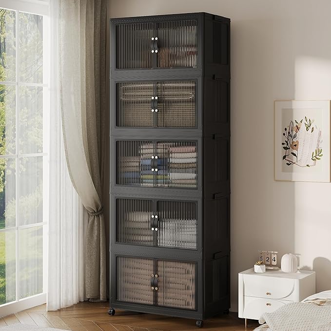 JONZEN 525Qt Stackable Storage Bins with Lid, 132 Gal Closet Organizer and Storage Drawer, Collapsible Storage Boxes with Wheels, Plastic Clothes Cabinet Containers, 5Pack Black