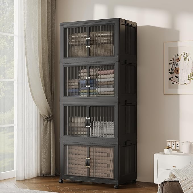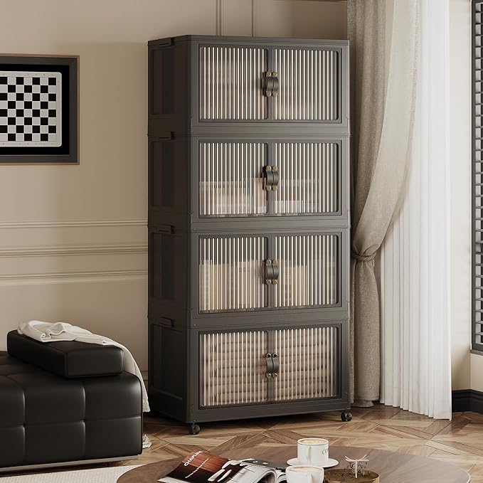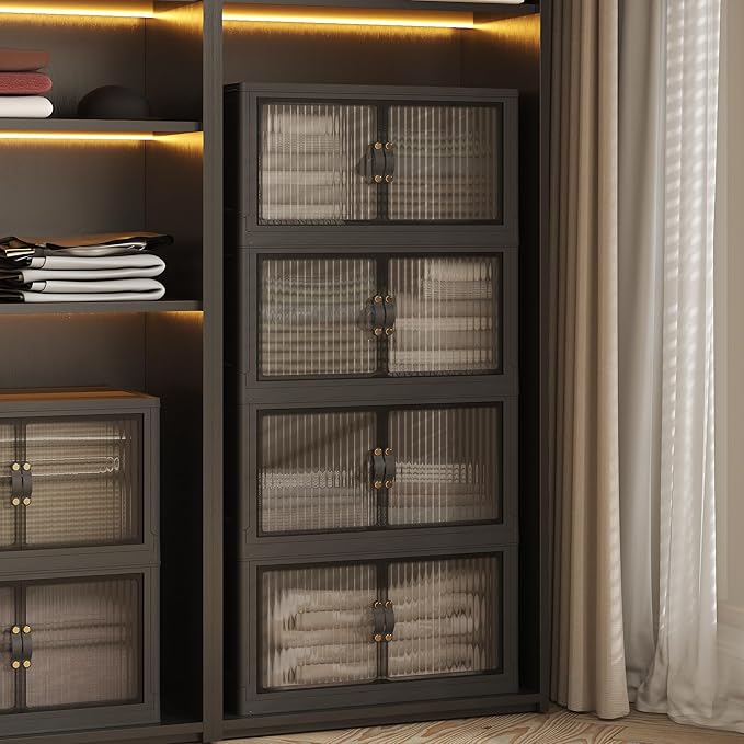 JONZEN 105Gal Extra Large Storage Bins with Lids, 420QT Stackable Collapsible Bins with Doors Wheels, Closet Organizers and Storage, Foldable Plastic Box Cabinet for Home Garage, 4Pack Black