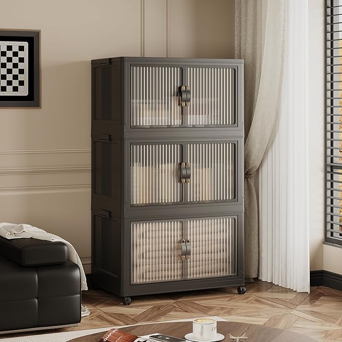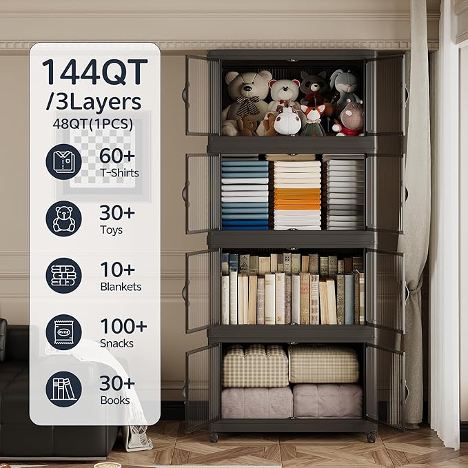 JONZEN 144Qt Stackable Storage Bins with Lid, 36GAL Collapsible Bins with Wheels, Closet Organizer and Storage Drawer, Plastic Clothes Storage Cabinet Containers for Home Garage, 3Pack Black