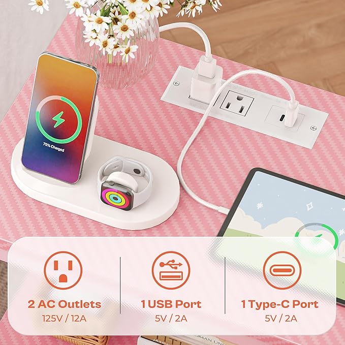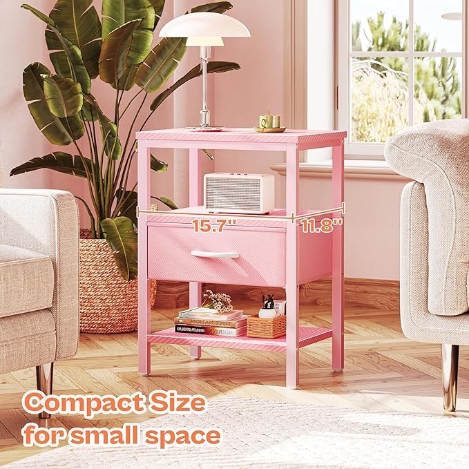 SUPERJARE Nightstand with Charging Station, Bed Side Table with Adjustable Fabric Drawer, Night Stand for Bedroom, 3-Tier Storage End Table, for Living Room, Pink