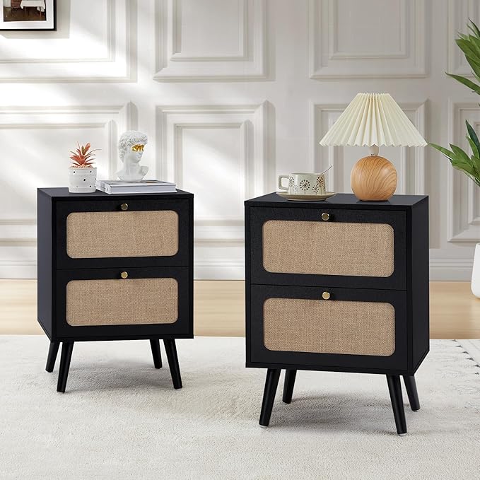 Mid Century Night Stand Set of 2, Modern Nightstand with 2 Drawers & Curved Linen Panel, Farmhouse End Table Wood Bedside Table Small Side Tables for Small Space, Bedroom (Black)
