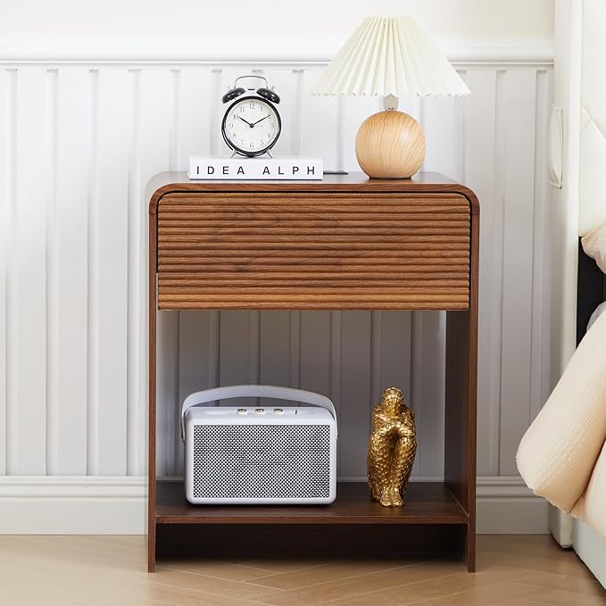 Fluted Nightstand with Charging Station, Mid Century Modern Bed Side Table End Table with Drawer Storage, Large Wooden Night Stands Bedside for Bedroom Living Room Sofa Office, Walnut