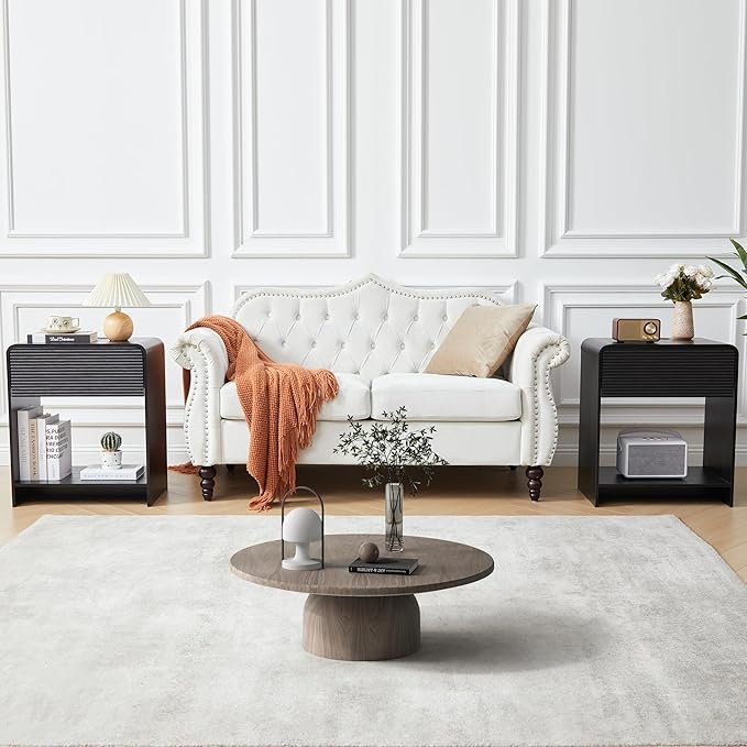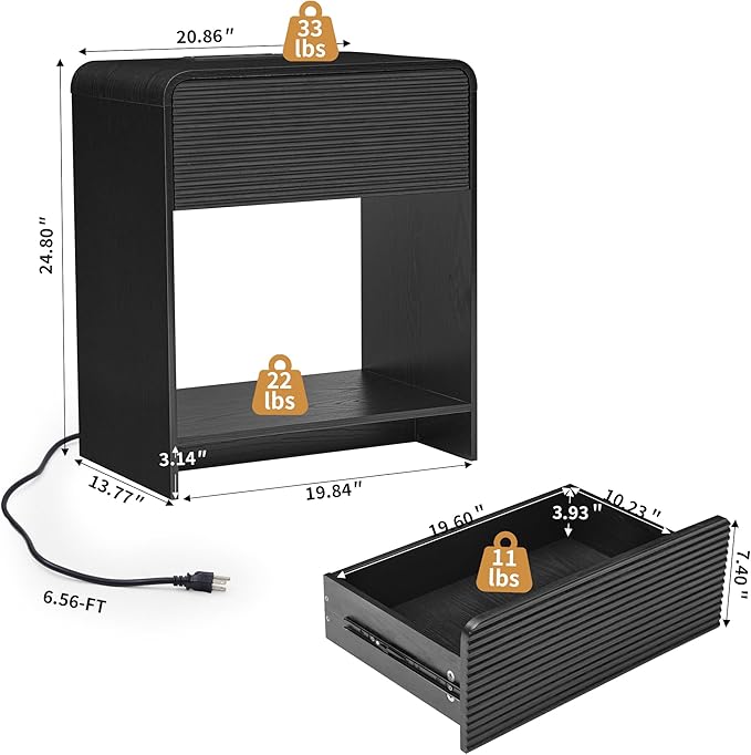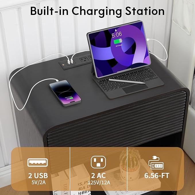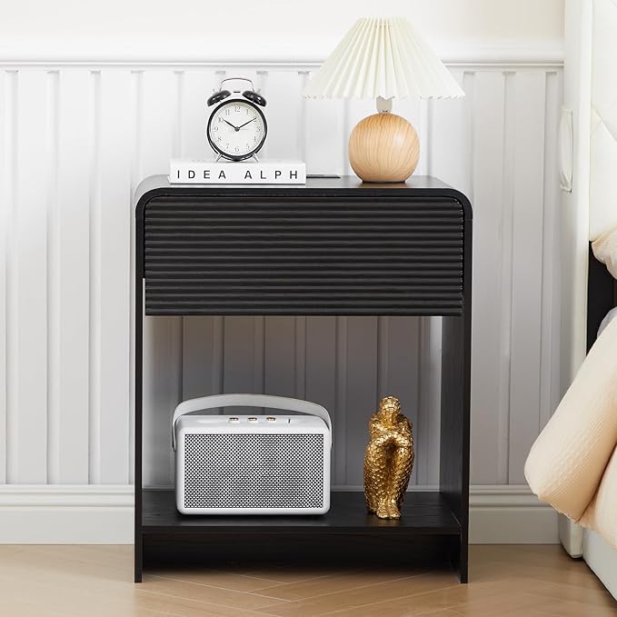 Fluted Nightstand with Charging Station, Mid Century Modern Bed Side Table End Table with Drawer Storage, Large Wooden Night Stands Bedside for Bedroom Living Room Sofa Office, Black