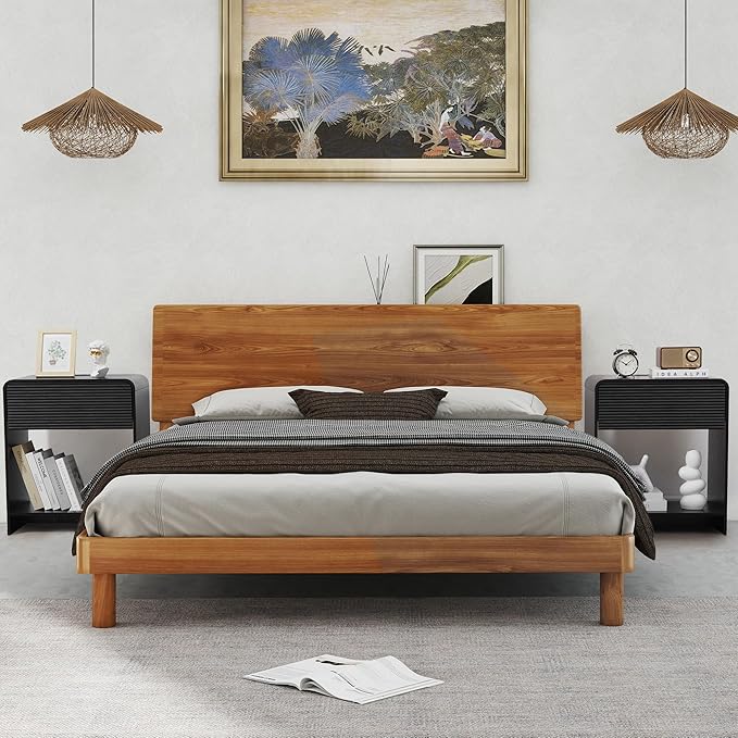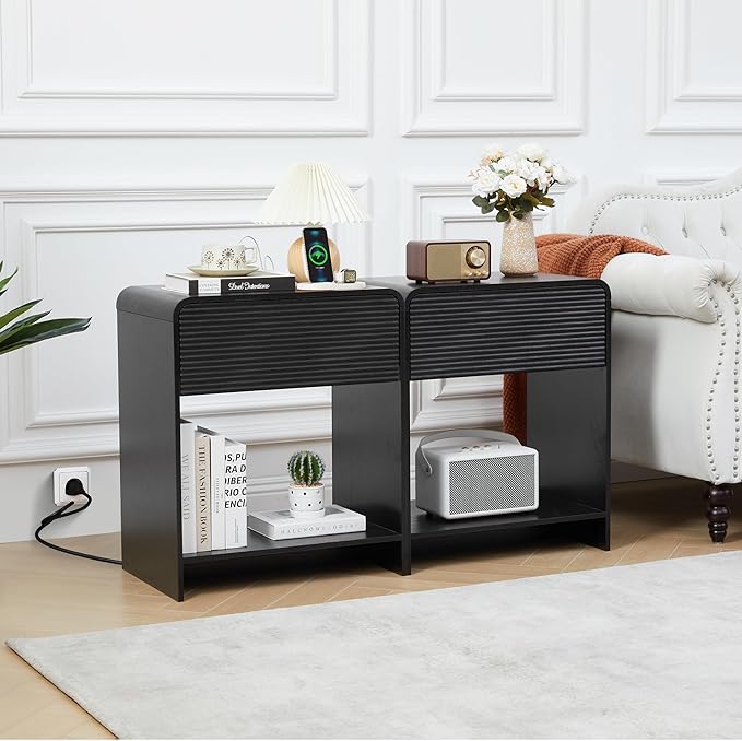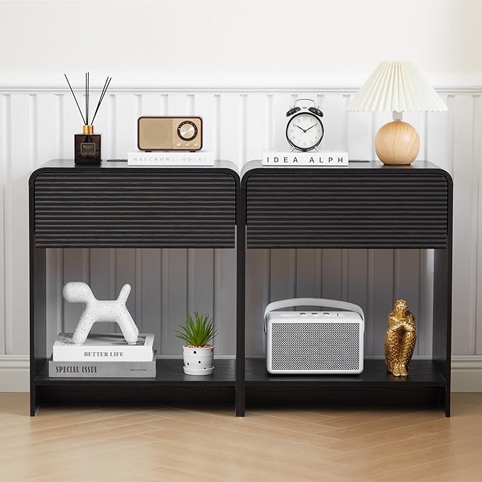 Fluted Nightstand Set of 2 with Charging Station, Modern Bed Side Table End Table with Drawer Storage, Large Wooden Night Stands Bedside for Bedroom Living Room Sofa Office, Black 2 Sets