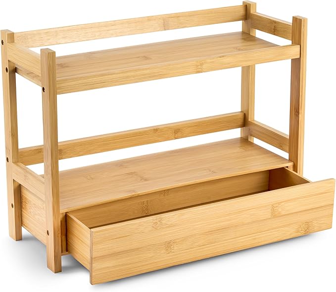 Sorbus Bamboo Bathroom Counter Organizer – 2-Tier Shelf with Hidden Drawer for Vanity, Matcha Station, Bathroom Sink Organizer Countertop, Kitchen & Office Storage (17″ L x 6.5″ W x 12.6″ H)
