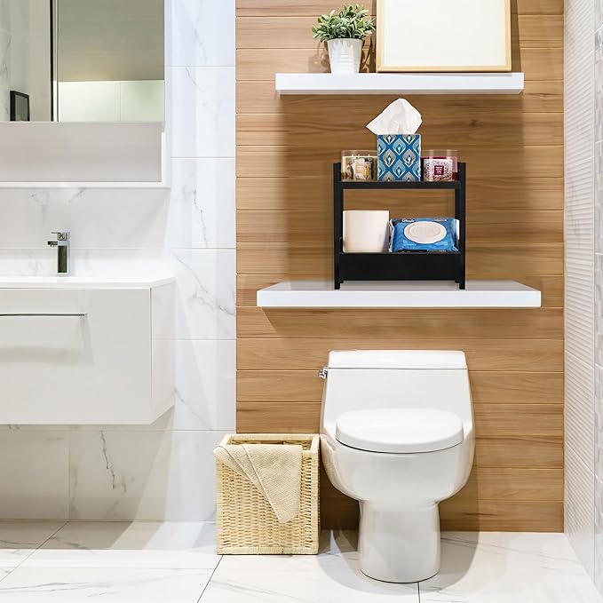 Sorbus Bamboo Bathroom Counter Organizer – 2-Tier Shelf with Hidden Drawer for Vanity, Matcha Station, Bathroom Sink Organizer Countertop, Kitchen & Office Storage (13″ L x 6.5″ W x 12.6″ H) (Black)