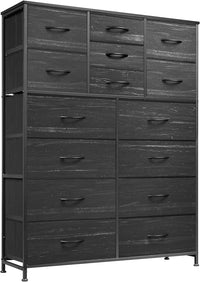 WLIVE Tall Console Table with 15 Fabric Drawers, Entryway Table with Storage, Tall Storage Organizer with Wood Top, Steel Frame for Living Room, Hallway, Office, Charcoal Black Wood Grain Print