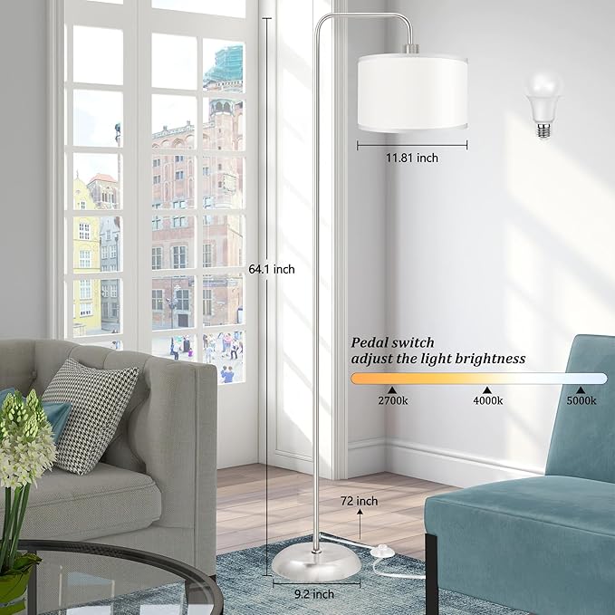 [Upgraded] LED Floor Lamp for Living Room, 3 Color Temperature Floor Lamp with Foot Switch Modern Standing Lamp Tall Pole Floor Reading Lamp for Bedroom Study Room, Bulb Included Silver (One Shade)