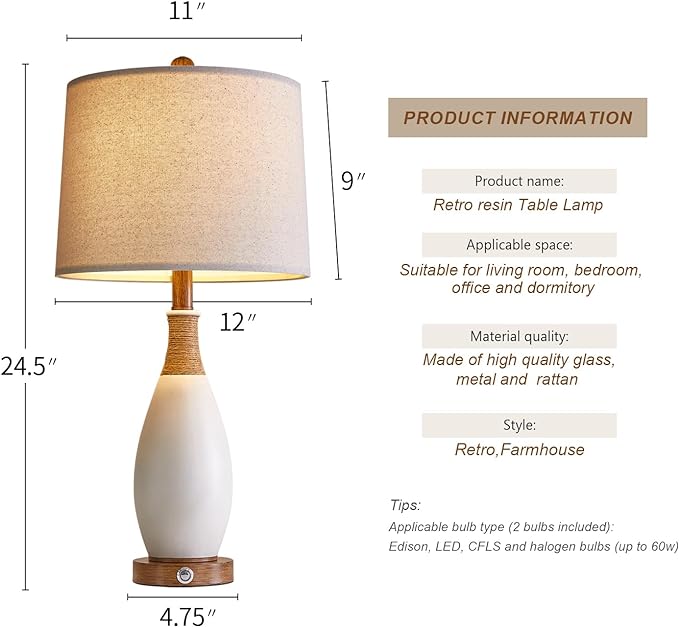 OYEARS 24.5” 3-Way Dimmable Touch Control Bedside Table Lamp Set of 2 with USB and Type-C Charging Ports Modern Farmhouse Nightstand Lamp for Bedroom Living Room (Bulb Included)