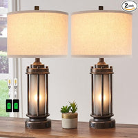 Set of 2 Farmhouse Lamps for Living Room, Rustic Vintage Bedroom Nightstand Table Lamp with 2 USB Charging Ports, Built-In Frosted Glass Night Light for End Table Entryway, 4 Bulbs Included (Bronze)