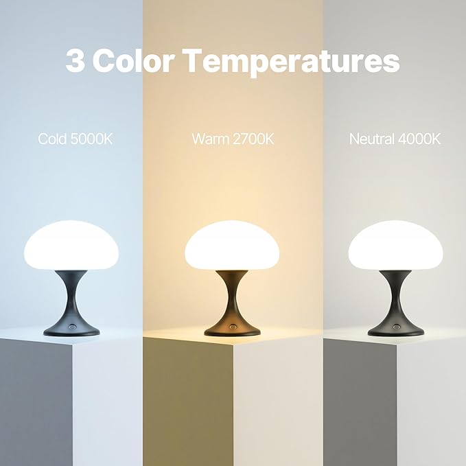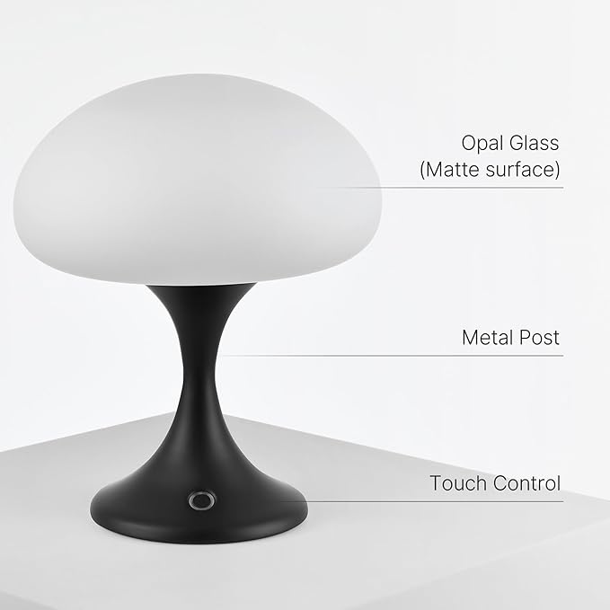 Mushroom Lamp, 5W LED Cordless Rechargeable Table Lamp with Glass Shade, Small Retro Dimmable Touch Light with 3 Color Temps, Aesthetic Mid Century Bedside Light for Bedroom Ambient, Black