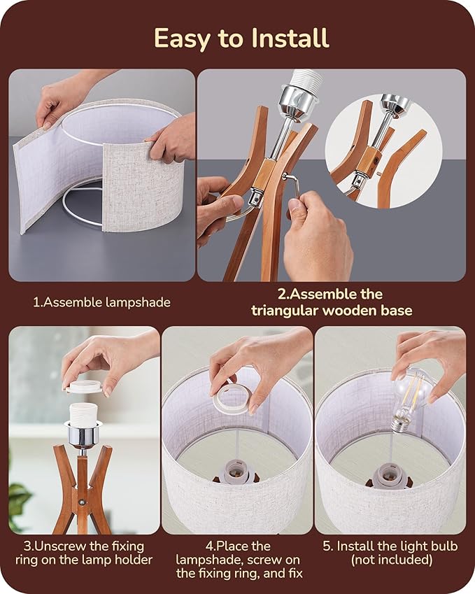 EDISHINE Mid Century Table Lamp, 17.5" Tripod Bedside Lamp with Deep Wood Color Light Base & Beige Linen Lampshade, Nightstand Lamp for Bedroom, Living Room, Reading Room, E26 Base