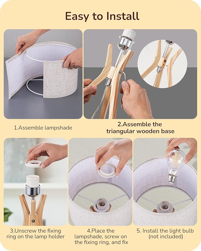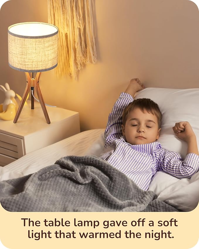 EDISHINE Tripod Table Lamp, 17.5" Modern Bedside Lamp with Natural Wood-Colored Lamp Legs & Beige Linen Lampshade, Boho Nightstand Lamp for Bedroom, Living Room, Reading Room, E26 Base