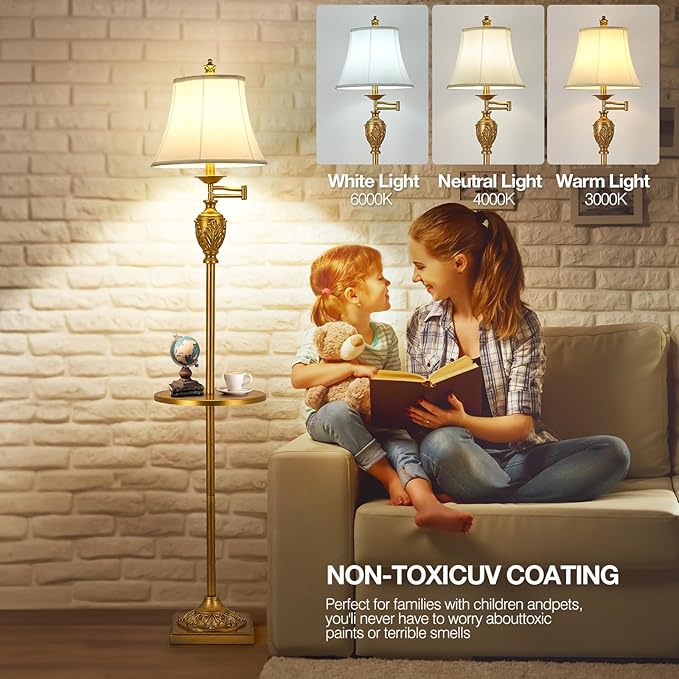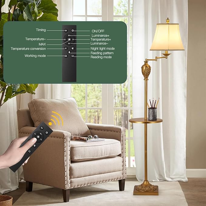Traditional LED Floor Lamp with 350° Adjustable Swing Arm Lamp – Vintage Standing Pole lamp for Living Room, Bedroom and Office – Rustic Upright Floor Light for Home Décor with Silk Fabric Shade