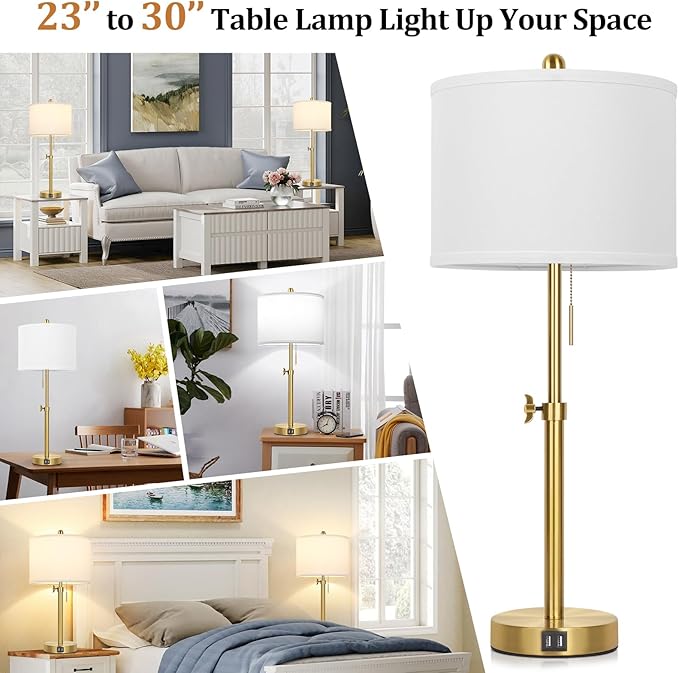 Table Lamp Set of 2, Bedside Lamp with 2 USB Ports, Gold Tall Table Lamp for Living Room End Tables, 23" to 30" Height Adjustable Lamp for Bedroom, Farmhouse Table Lamps with Pull Chain, E26