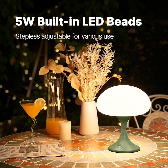 Mushroom Lamp, 5W LED Cordless Rechargeable Table Lamp with Glass Shade, Small Retro Dimmable Touch Light with 3 Color Temps, Aesthetic Mid Century Bedside Light for Bedroom Ambient, Green