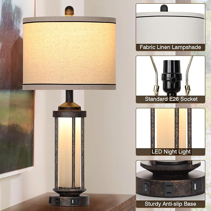 27" Farmhouse Industrial Table Lamps, Vintage Rustic Retro Beside Lamps with USB A+C Charging Ports & AC Outlet, Modern Nightstand Lamps with Glass LED Night Light for Living Room Bedrooms End Table
