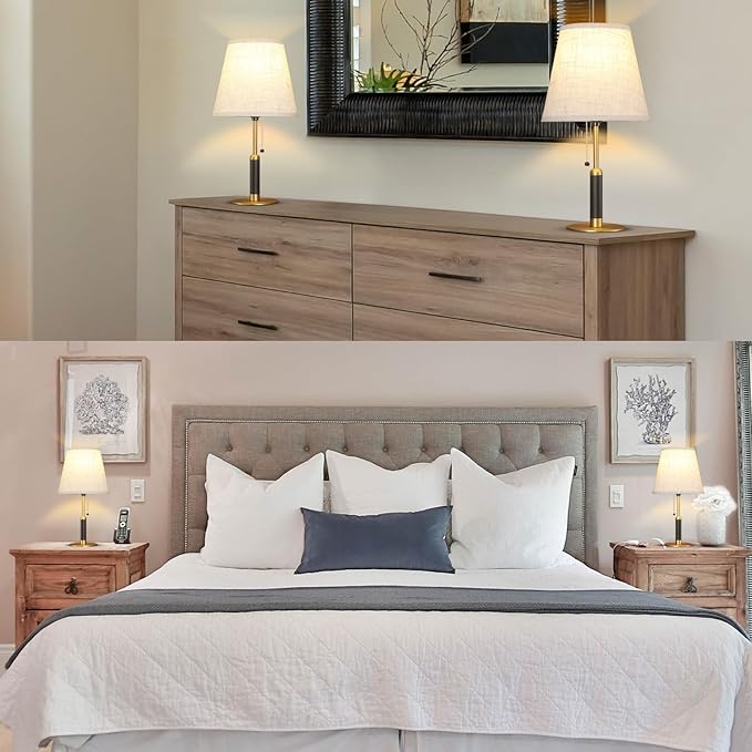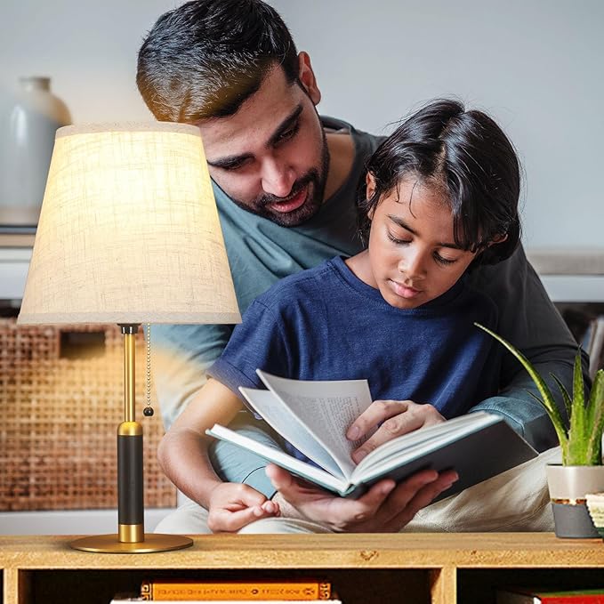 18.9" Bedside Lamps Set of 2 Small Vintage Table Lamp for Bedroom Nightstand Lamp for Living Room 3-Color Temperatures Pull Chain Wood Fabric for Home Office Dorm Decor (Light Brown+Brass)