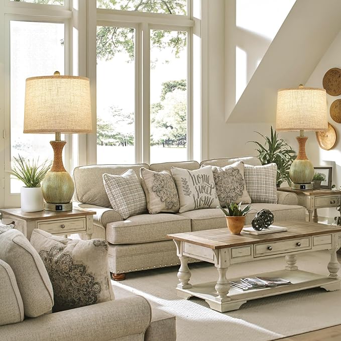 Bedside Table Lamp Set of 2 - Bedroom Table Lamps with 3 Color Temperatures - Boho Rattan Lamps with USB A+C Charging Ports Grey Farmhouse Living Room Lamps for Reading Bulbs Included