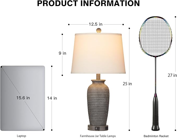 25" Farmhouse Jar Table Lamps, 3 Way Touch Control Rustic Bedside Lamps with USB A+C Ports & AC Outlet, Pot Nightstand Lamps for Bedroom Living Room (LED Bulbs Included)