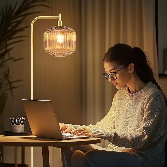 QiMH Glass Floor Lamp for Living Room, Modern Standing Lamp with Ribbed Champagne Glass Lampshade Pedal Switch, 67” Tall Lamp for Bedroom Study Room, Brushed Gold (2700K LED Bulb Included)
