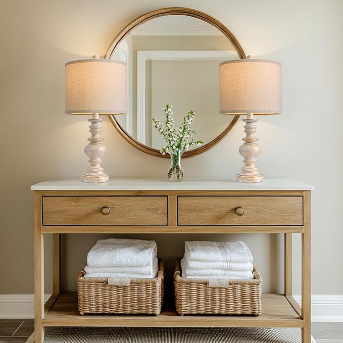 BOBOMOMO 20" Retro Table Lamps Set of 2 - Farmhouse Lamp for Living Room with Linen Shades, Rustic Bedside Nightstand Lamps, Resin Lamps for Bedroom Nursery Room Hallway - Ideal for Compact Spaces