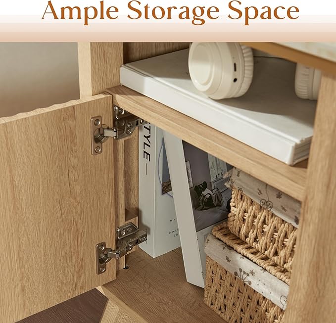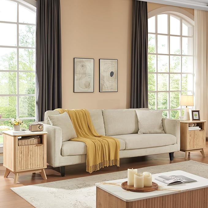 QUW Fluted Nightstand with Charging Station, Bedside Table with Open Storage and Cabinet, 18" Modern Side Table, End Table for Bedroom, Living Room, Natural Oak