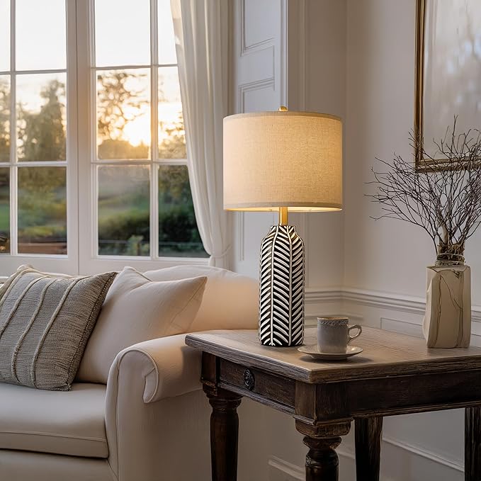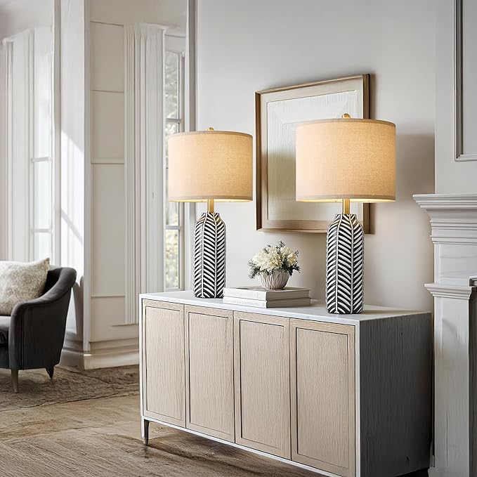 BOBOMOMO 26" Farmhouse Black Table Lamps Set of 2 – Rustic Resin Lamps with Vintage Leaf Pattern and Linen Shades, Black Bedside Lamps for Bedroom, Living Room, Office, Entryway, Console Table