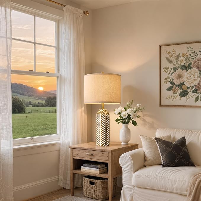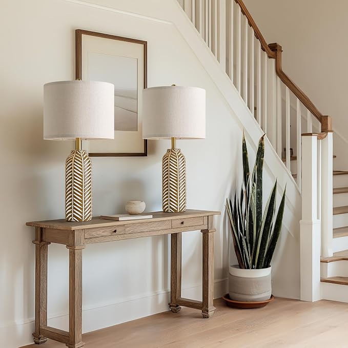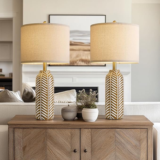 BOBOMOMO 26" Farmhouse Table Lamps Set of 2 - Vintage Leaf Design, Rustic Resin Nightstand Lamps for Bedroom, Living Room, Nursery, Hallway, Elegant Living Room Lamps with Linen Shades Antique Brown
