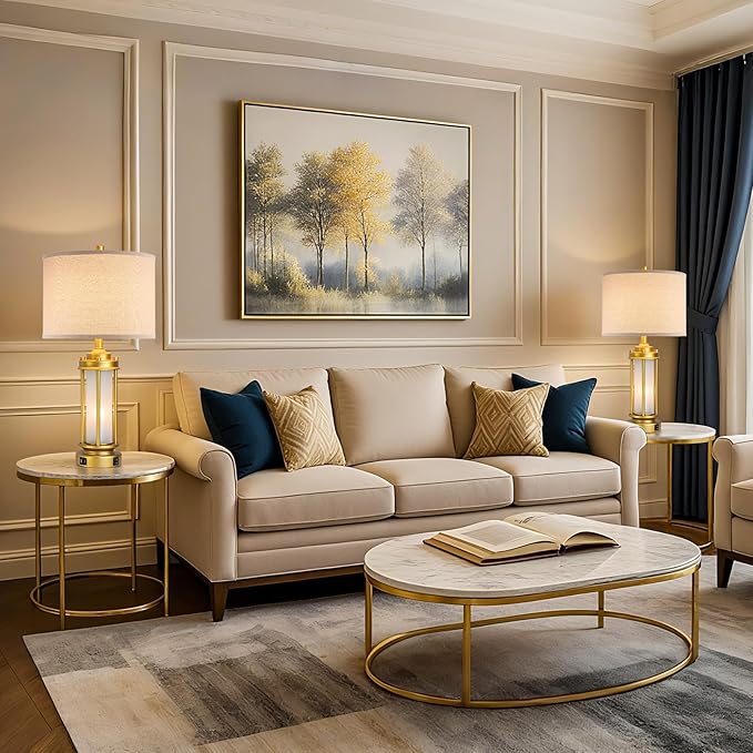 Modern Bedroom Table Lamps Set of 2, Farmhouse Vintage Bedside Lamp with 2 USB Ports, Gold Nightstand Desk Lamps with Glass Nightlight for Living Room Entryway Dresser, 4 Bulbs Included