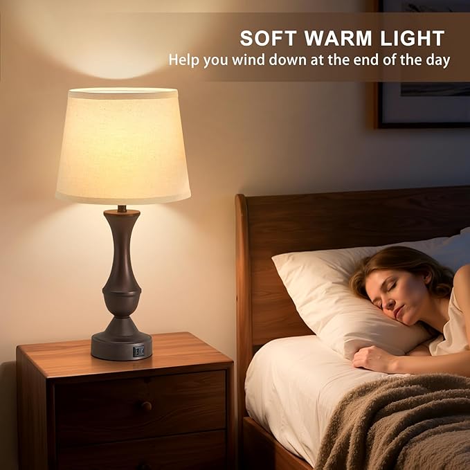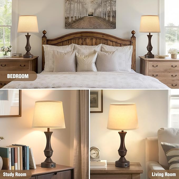 Luvkczc 22" Table Lamp Set of 2 - Vintage Brown Bedside Lamp with Beige Fabric Shade, 3-Way Dimmable, USB C+A Ports, Nightstand Lamp for Living Room Bedroom (Bulb Included)