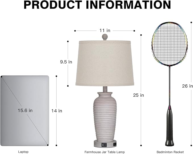 25" Vintage Farmhouse Jar Table Lamps, Single Rustic Bedside Lamp with USB A+C Ports & AC Outlet, Nightstand Lamps for Living Room, Bedroom, End Table, Grey White(LED Bulb Included)