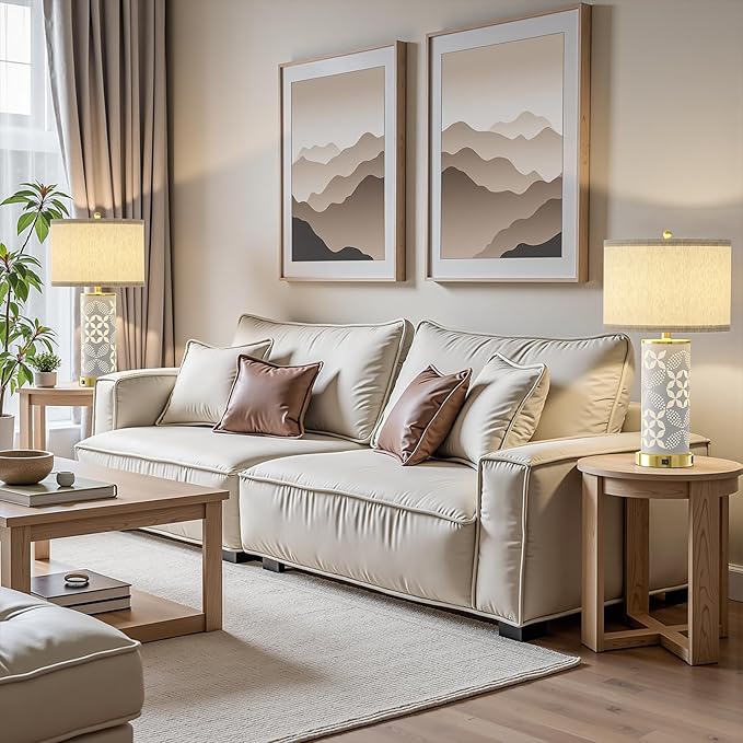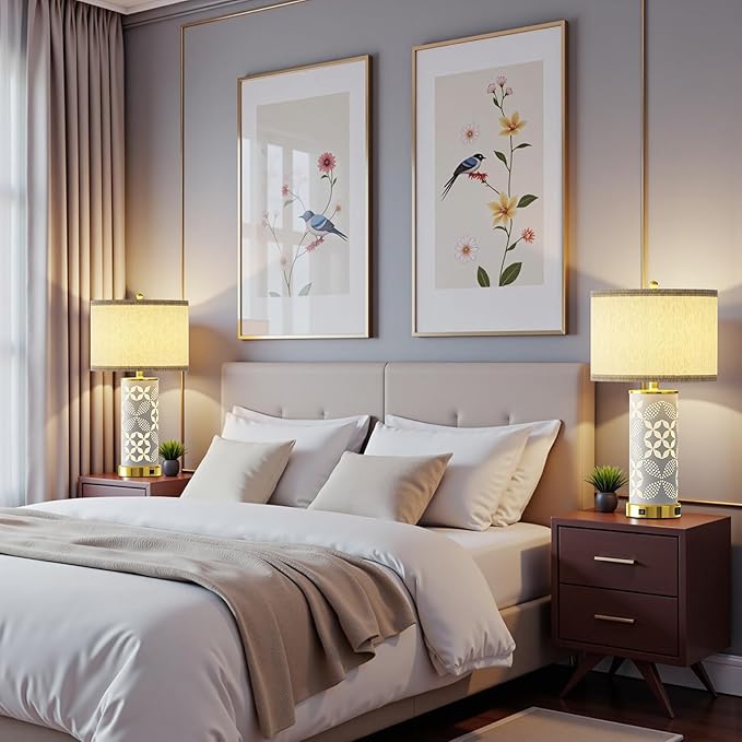 22'' Modern Ceramic Table Lamps Set of 2, Bedside Lamps with Hollow-Out Ceramic Design,USB A+C & 3 Color Temperature, Lamps for Night Stands with Night Light for Living Room and Bedroom(with 2 Bulbs)