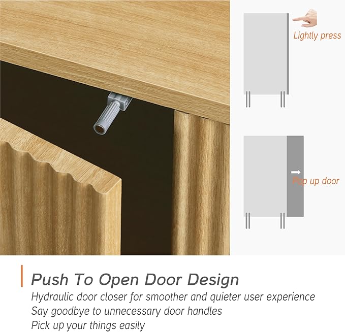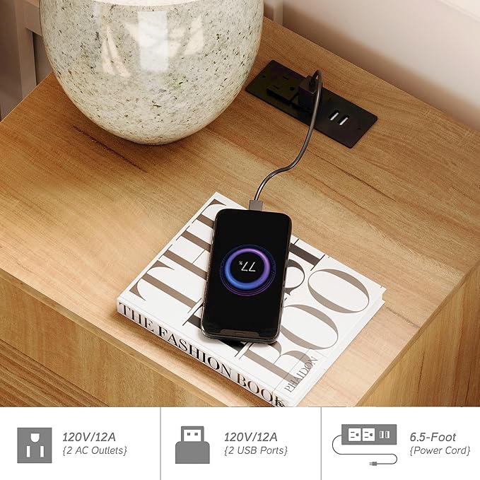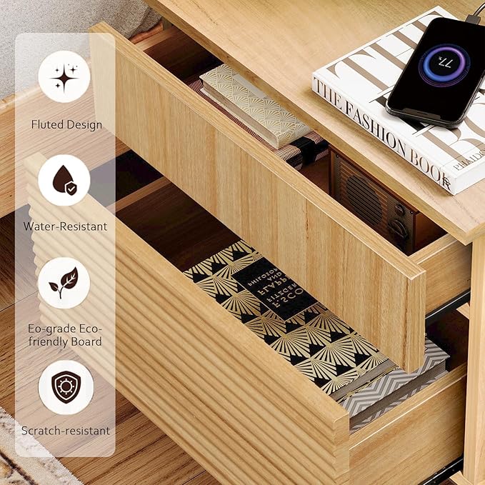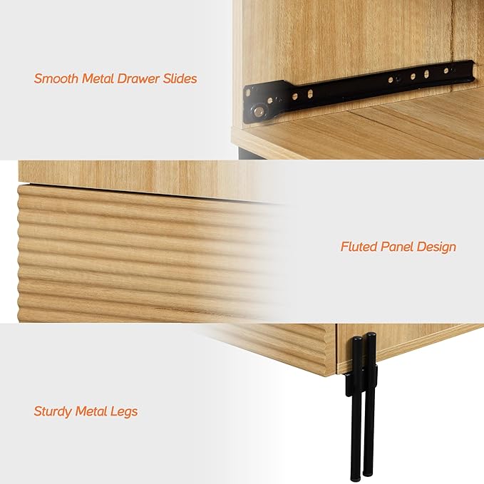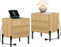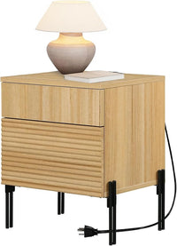 WAMPAT Fluted Nightstand with Charging Station,19.7" Tall Mid Century Modern Night Stands, Wood Side End Table with 2 Drawers, Wood Bedside Table with Metal Legs for Bedroom,Living Room, Oak