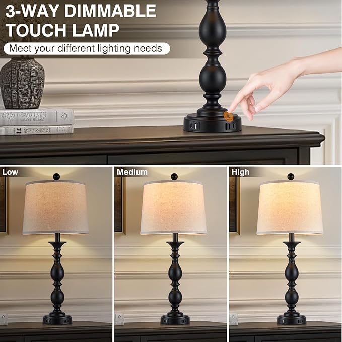 28" Tall Modern Table Lamps Set of 2 with USB C+A Ports and AC Outlet, 3 Way Touch Metal Bedside Lamps for Living Room, Black Farmhouse Nightstand Lamps for Bedroom