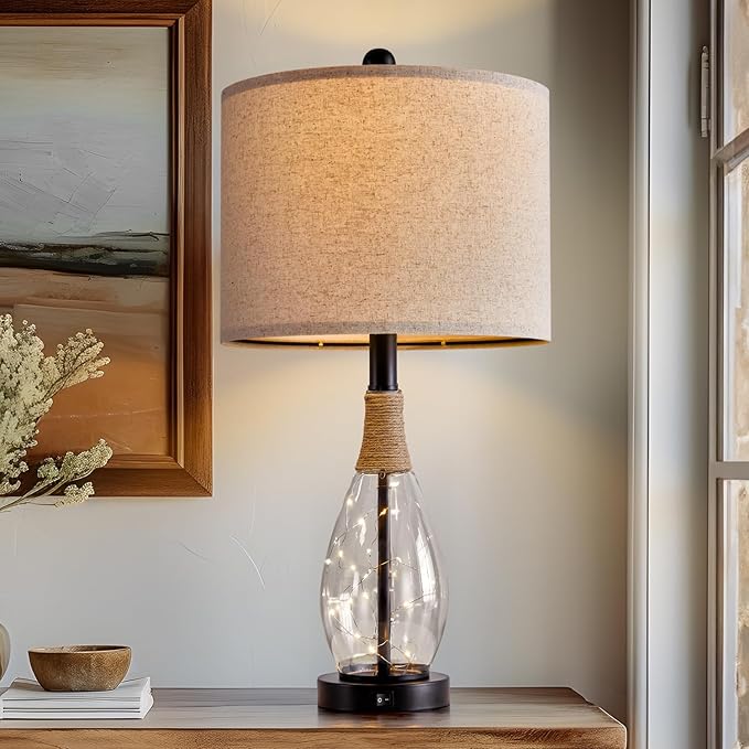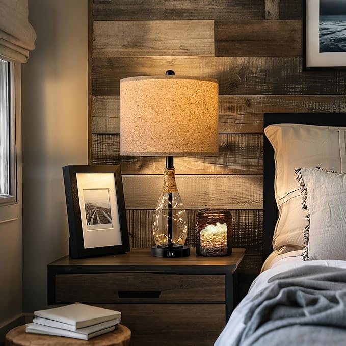 OYEARS 23" Farmhouse Table Lamps for Living Room,Boho Rattan Bedside Lamps with USB-C & USB-A Ports, Glass Nightlight, Dual Light Sources, Black