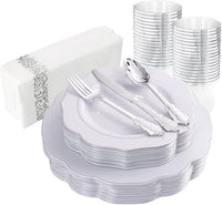 NOCCUR 175pcs Silver Plastic Plates - Christmas Plates - Silver Rim Plastic Tableware Include 25 Dinner Plates, 25 Dessert Plates, 25 Forks, 25 Knives, 25 Spoons for Wedding&Party