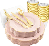 NOCCUR 175PCS Pink Plates with Gold Disposable Silverware - Include 50 Pink Plastic Plates,25 Knives,25 Forks,25 Spoons,25 Cups and 25 Napkins - Ideal for Wedding/Party