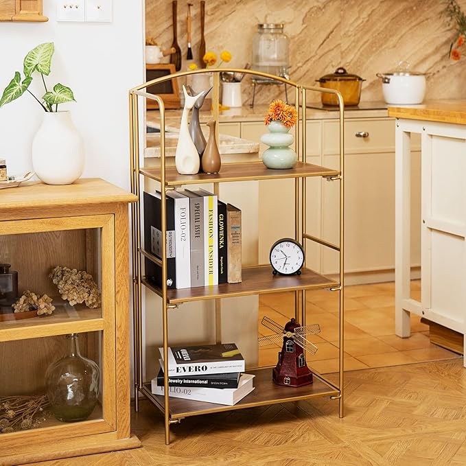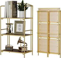 Crofy No Assembly Folding Bookshelf for Living Room, 3 Tier Gold Collapsible Book Shelf for Home Office, Portable Bookcase Storage Organizer