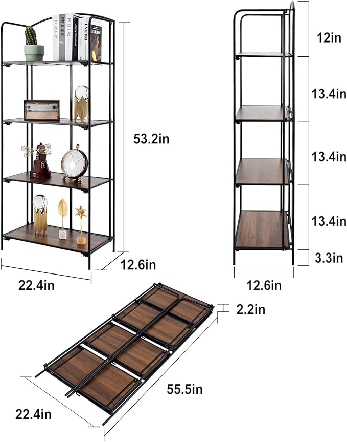 Crofy No Assembly Folding Bookshelf for Living Room, 4 Tier Black Collapsible Book Shelf for Home Office, Portable Bookcase Storage Organizer
